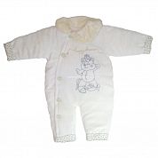 Комбинезон с отложным асимметричным воротником, ножки и рукава на манжете с отворотом, спереди на пуговицах от горловины до конца одной ножки. Спереди комбинезон украшен вышивкой.