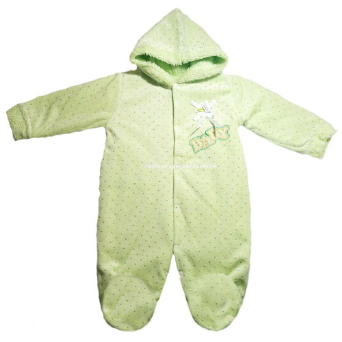 Комбинезон с капюшоном, с закрытыми ножками, с рукавами на манжете, спереди и между ножек на кнопочках. По всему полю выполнена накатка в виде точек золотистого цвета, спереди комбинезон украшен объёмной розочкой и вышивкой.